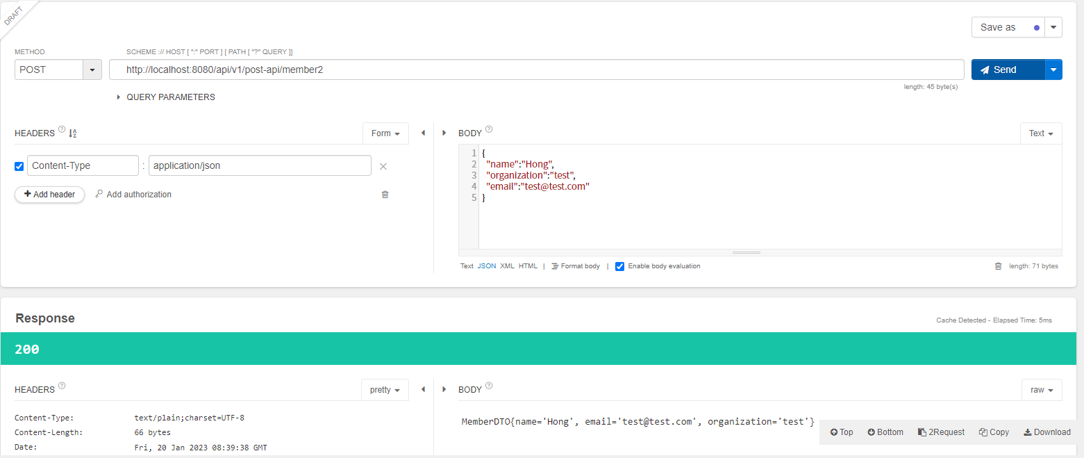 @PostMapping(value="/member2") public String postMember2(@RequestBody MemberDTO memberDTO){ return memberDTO.toString(); }๋ค์ URI์ BODY๋ฅผ POST ๋ฐฉ์์ผ๋ก ์ ๋ฌํ ๊ฒฐ๊ณผ์ด๋ค.