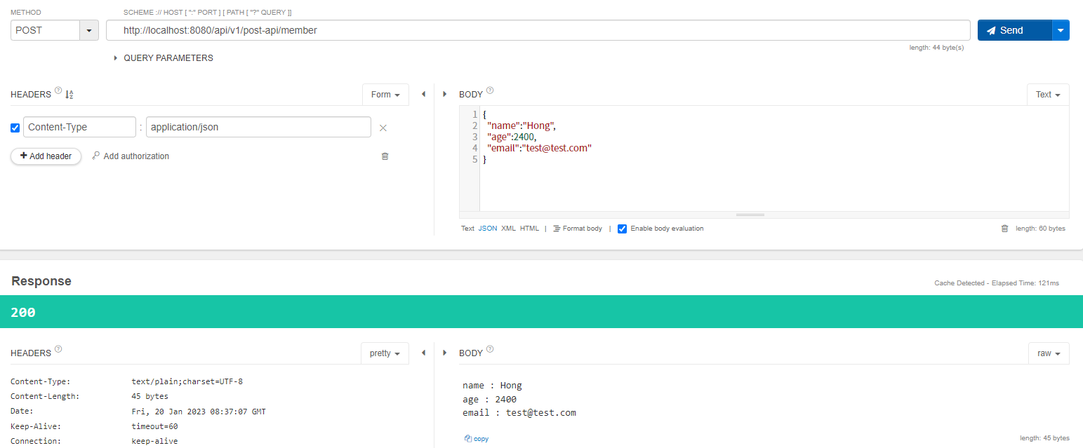 ๐กhttp://localhost:8080/api/v1/post-api/member{ "name":"Hong", "organization":"test", "email":"test@test.com" }