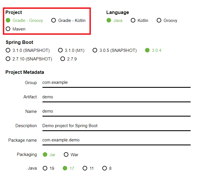 start.spring.io 사이트에서 프로젝트 관리 도구의 선택