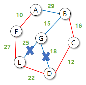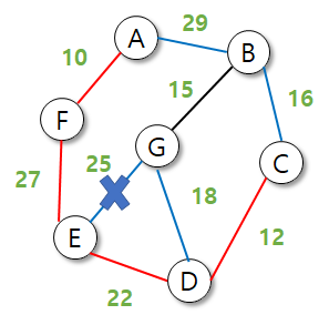 따라서 G에서 다른 최소 간선과 잇는 것이 최소비용을 반환하므로 25를 후보에서 제거한다.